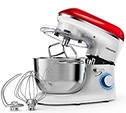 Küchenmaschine Knetmaschine Freihafen 1400W. 5.5L Reduzierte Geräusche Knetmaschine mit Rührbesen. Knethaken. Schlagbesen. Spritzschutz. 6 Geschwindigkeit mit Edelstahlschüssel Teigmaschin (Rot-weiß)